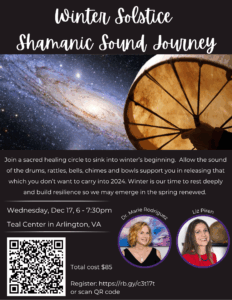 This Winter Solstice, you will have an opportunity to experience the altered states of consciousness associated with shamanism. Allow Marie and Liz to guide you on a shamanic sound journey for restoration and release of all that you do not wish to bring into the new year.
